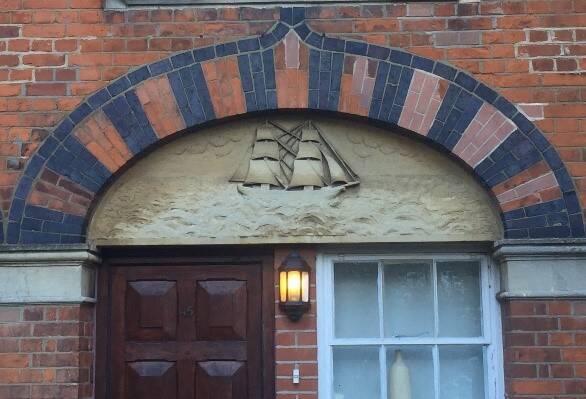 No.45: 3 relief carvings of ships of the age in which it was built. One of the carvings on the front, although damaged, shows a ship under sails, but with a funnel amidships, which shows that it had a steam engine onboard.