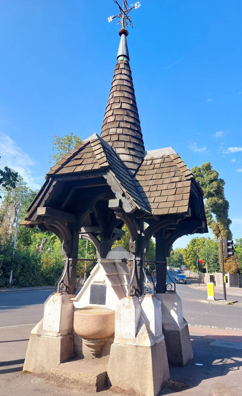 This three-sided former drinking fountain and horse trough was erected in 1897 to commemorate Queen Victoria’s Diamond Jubilee. It’s currently situated on the north corner of Wanstead Green but has been moved several times due to road development. It’s somewhat similar to the fountain at the Snaresbrook end of the High Street built 15 years earlier in 1872. This one is red brick on a granite plinth with a gabled roof and small spire and is listed by Historic England as Grade 2.